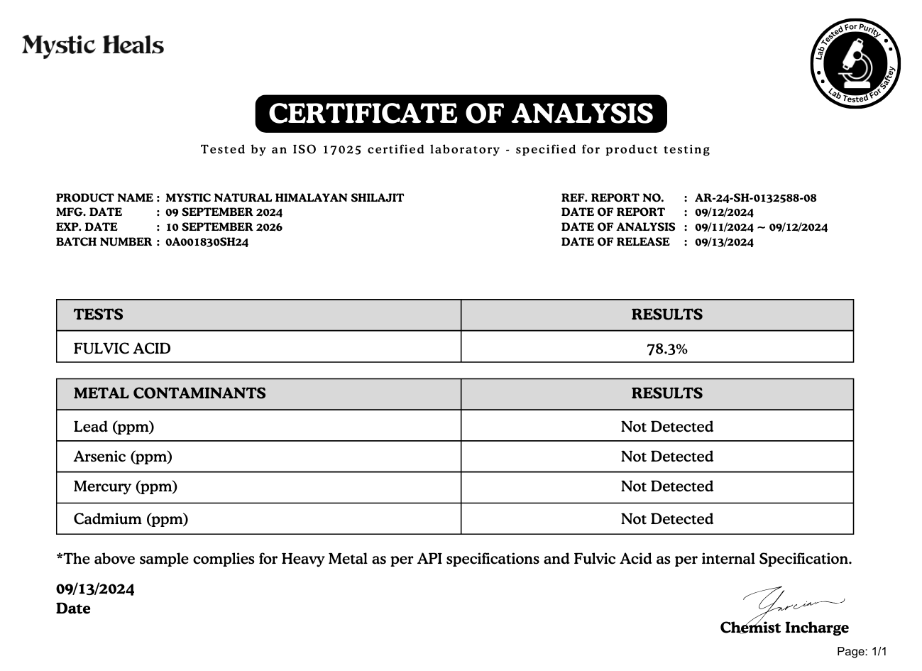 Mystic Shilajit contains over 87+ minerals and 78.3% of fulvic acid to help with: